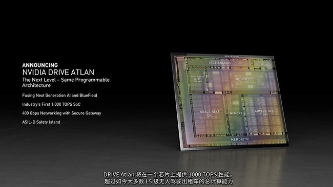 NVIDIA DRIVE Atlan是新一代AI自动驾驶汽车处理器,算力将达到1000TOPS,约是上一代Orin处理器的4倍,超过了绝大多数现有无人驾驶出租车的子女计算能力。