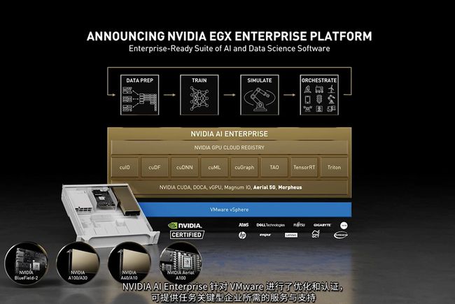 这一系统可运行NVIDIA AI Enterprise软件套件,该套件得到了全球应用最广泛的计算虚拟化平台——VMware vSphere 7的独家认证。