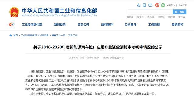 工信部网站信息显示,日前,工信部发布《关于2016-2020年度新能源汽车推广应用补助资金清算审核初审情况的公示》(以下简称公示)。公示显示,此次清算涉及2016-2020年完成销售上牌的109.74万辆新能源汽车,应清算补贴资金329.46亿元。